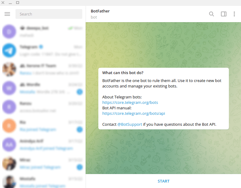 To build a Telegram bot with Right Tick, first, open your Telegram App. Then in the search bar of the app, search with the ‘BotFather’ keyword. Then select the verified BotFather account.